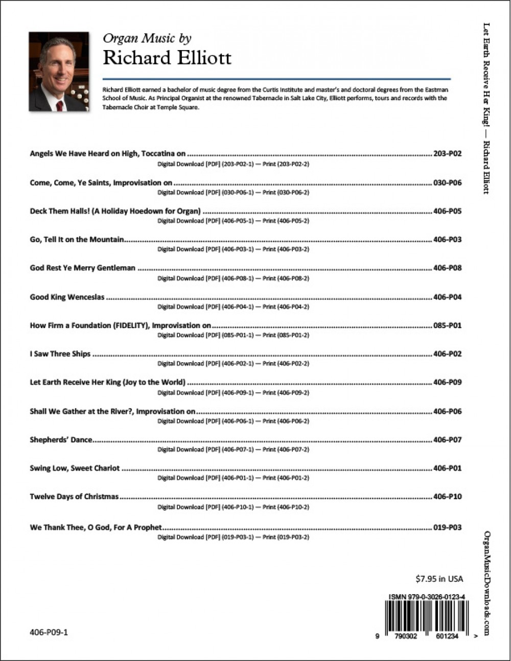 The energetic and creative "Let Earth Receive Her King!", composed by Richard Elliott, Principal Organist at the world-famous Tabernacle in Salt Lake City, is a delight for both the performer and the listener.