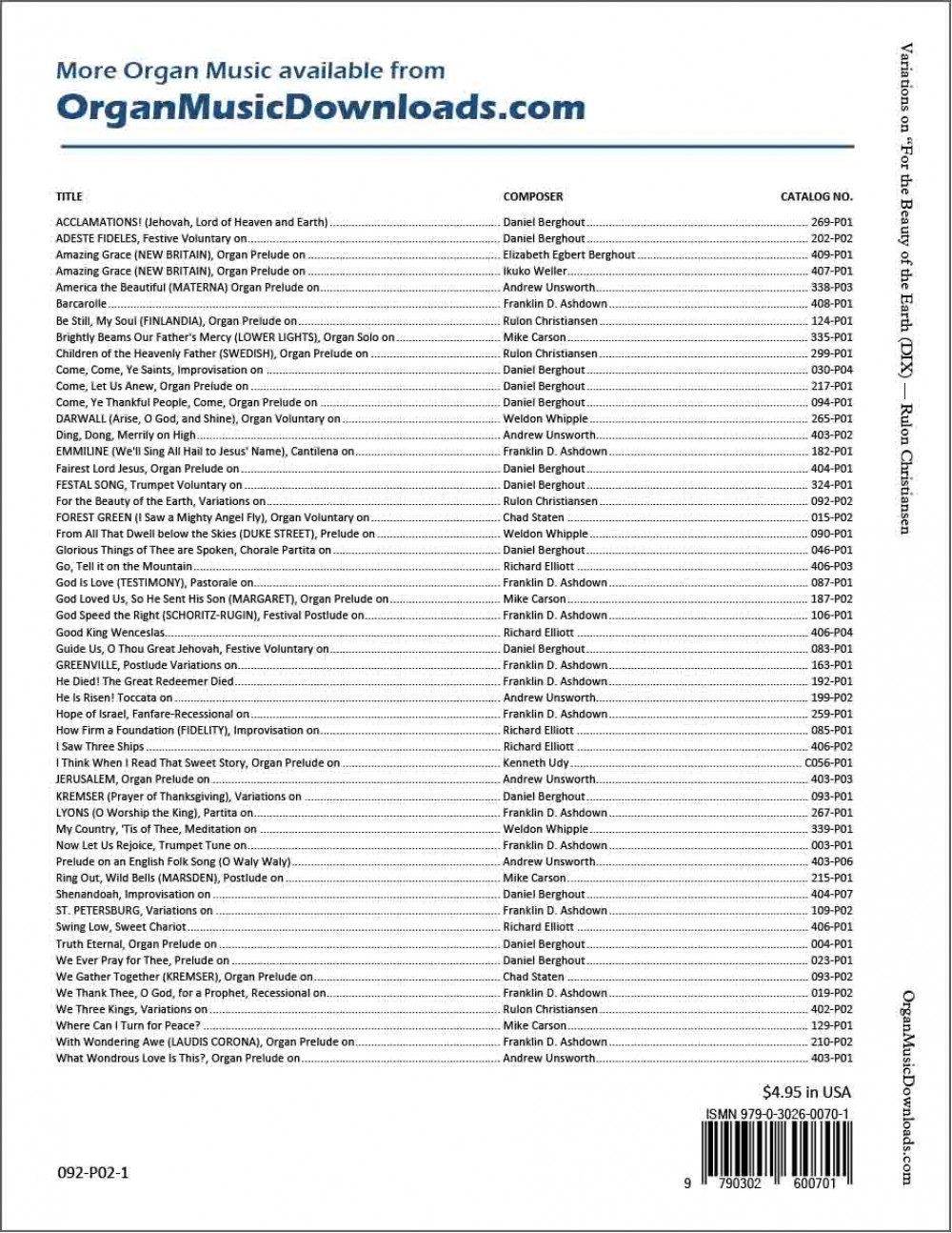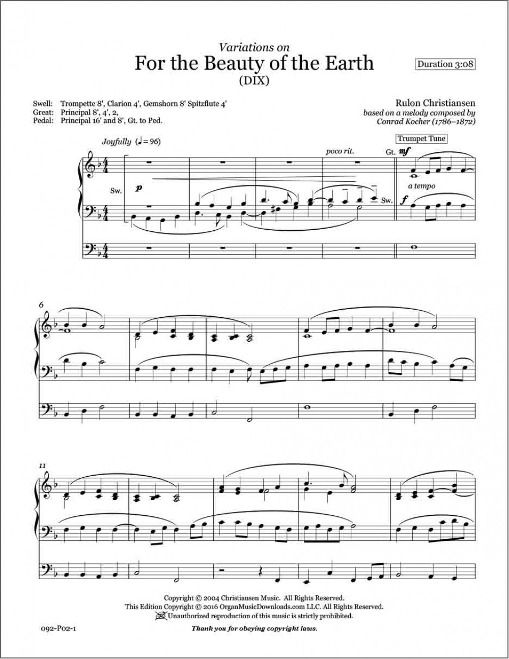 Rulon Christiansen has crafted a marvelous set of variations on the popular hymn "For the Beauty of the Earth." Variations include: Trumpet Tune, Duo, Canon, and Toccata.